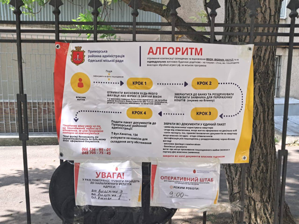 Жителі пошкоджених квартир можуть звертатися за допомогою до спеціалізованих штабів або зателефонувати до Приморської районної адміністрації за номером 066-73-69-501 та до Хаджибейської районної адміністрації за телефонами: (048) 752-96-16, (048) 752-96-17.